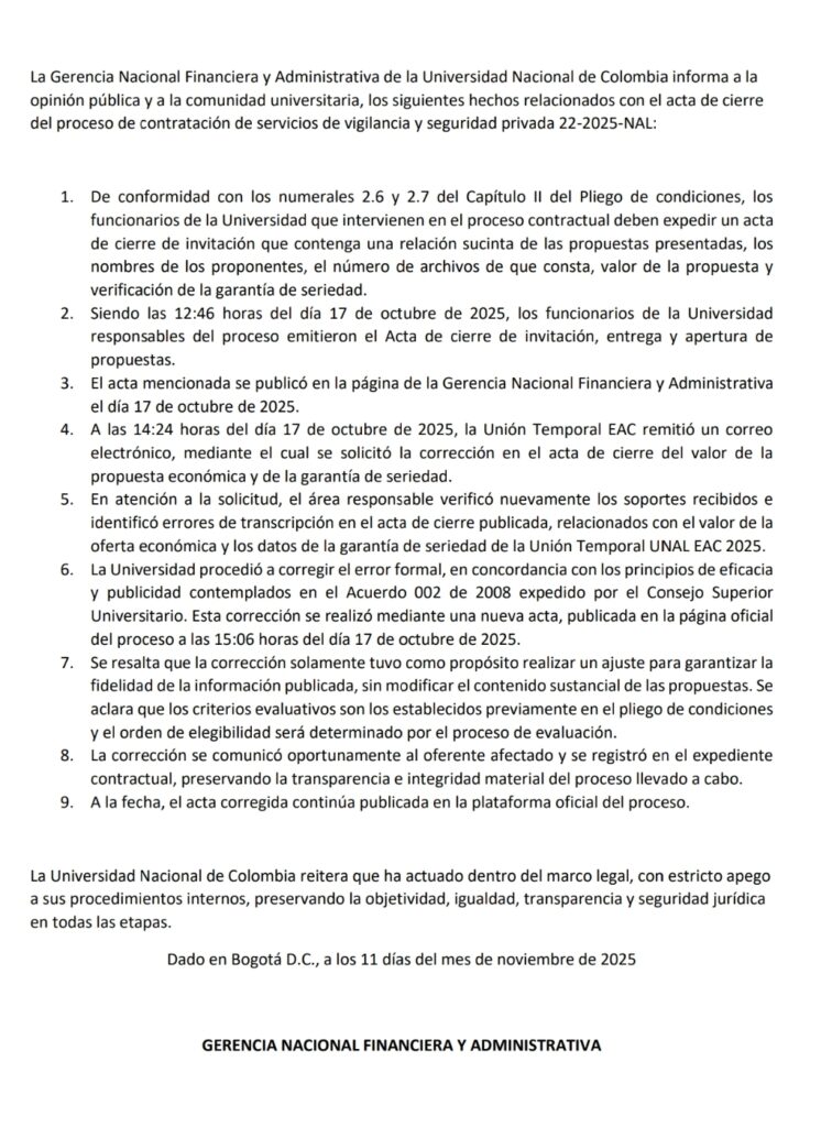 El comunicado firmado por la gerencia administrativa y financiera de la universidad Nacional, justifica el cambio como una «corrección técnica» solicitada por la unión temporal, alegando un error en la transcripción de la oferta.