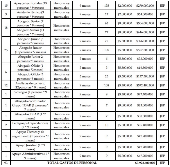 Objeto del contrato: ‘’Aunar esfuerzos técnicos, administrativos, financieros y de cooperación con la Secretaría Ejecutiva de la JEP en la implementación del Sistema Autónomo de Asesoría y Defensa (SAAD), gestionando el equipo que garantizará el derecho de defensa y debido proceso a través de labores de asesoría y defensa judicial integral a los comparecientes exintegrantes FARC en el marco de las actuaciones de la JEP, teniendo en cuenta el enfoque diferencial, territorial y de género’’. El contrato también contempla gastos de viajes y otros adicionales.